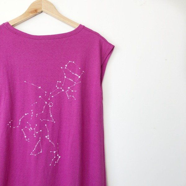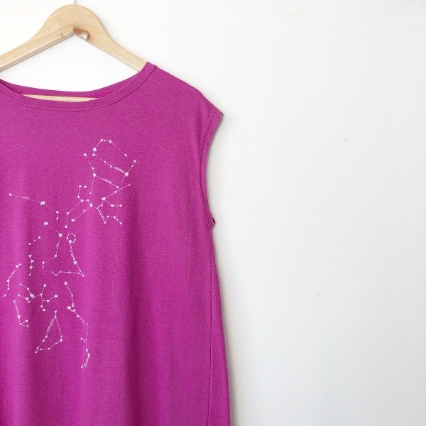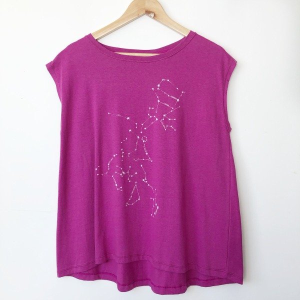 Cada una de nuestras prendas son únicas, estampadas a mano con tintas al agua en nuestra tienda taller. Son prendas amplias que priorizan la comodidad y la optimización de las telas, evitando descartes textiles innecesarios.