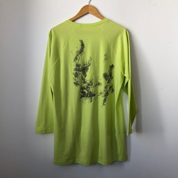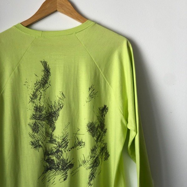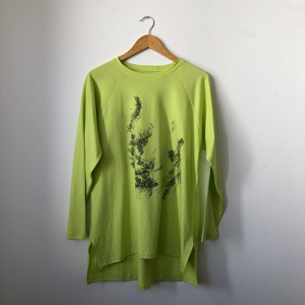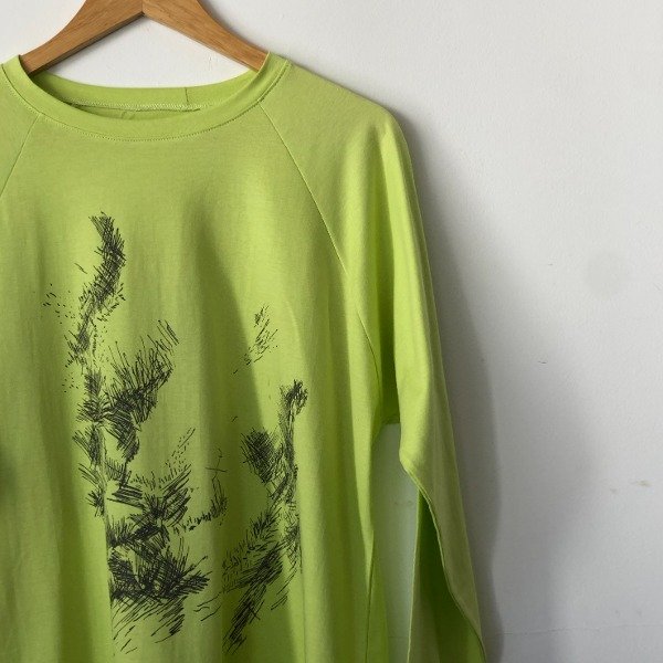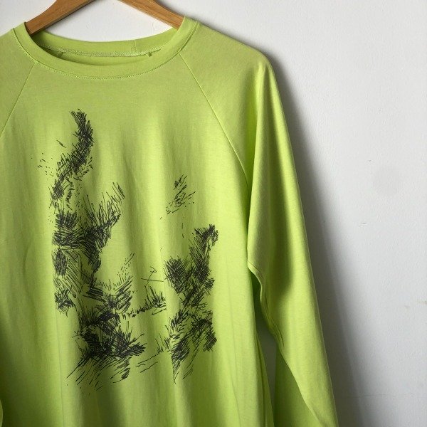 Cada una de nuestras prendas son únicas, estampadas a mano con tintas al agua en nuestra tienda taller. Son prendas amplias que priorizan la comodidad y la optimización de las telas, evitando descartes textiles innecesarios.