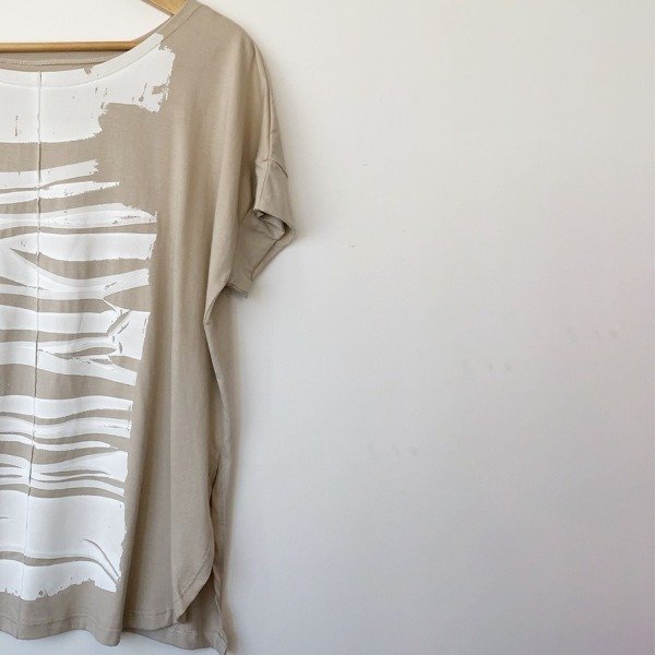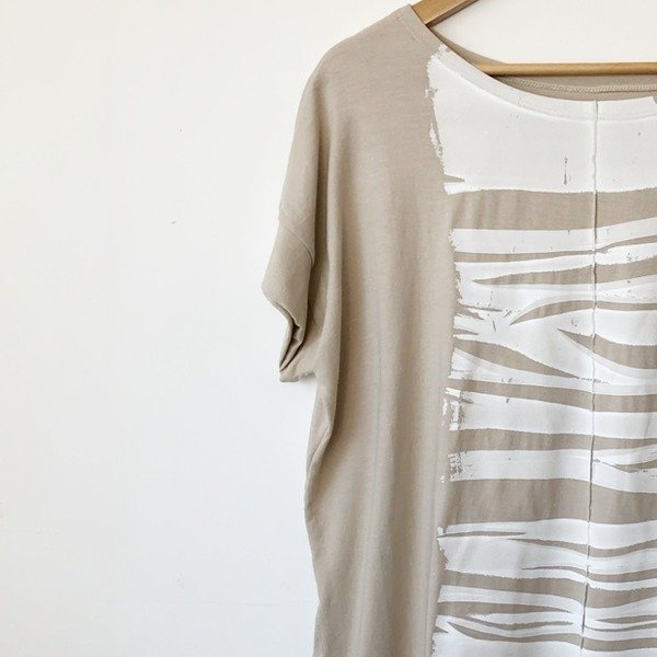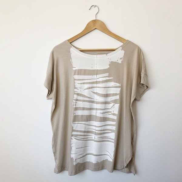 Cada una de nuestras prendas son únicas, estampadas a mano con tintas al agua en nuestra tienda taller. Son prendas amplias que priorizan la comodidad y la optimización de las telas, evitando descartes textiles innecesarios.