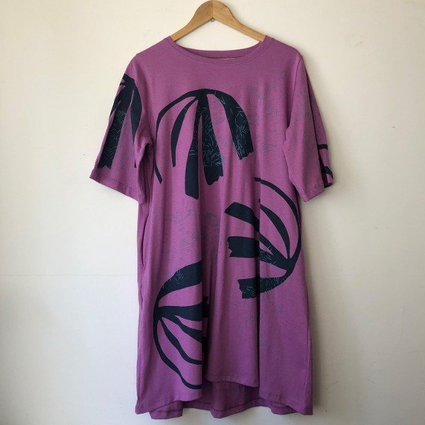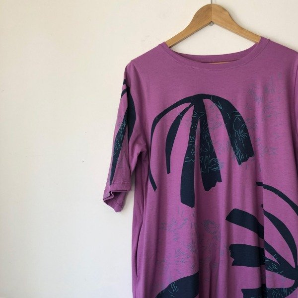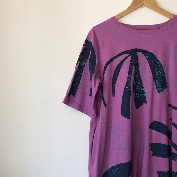 Cada una de nuestras prendas son únicas, estampadas a mano con tintas al agua en nuestra tienda taller. Son prendas amplias que priorizan la comodidad y la optimización de las telas, evitando descartes textiles innecesarios.